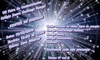 A Feira de Conhecimentos da Escola Estadual Daura Santiago Rangel será realizada no dia 9 de Dezembro, nos horários: 10:00 h às 15:00 h e 19:00 h às 22:00 h.